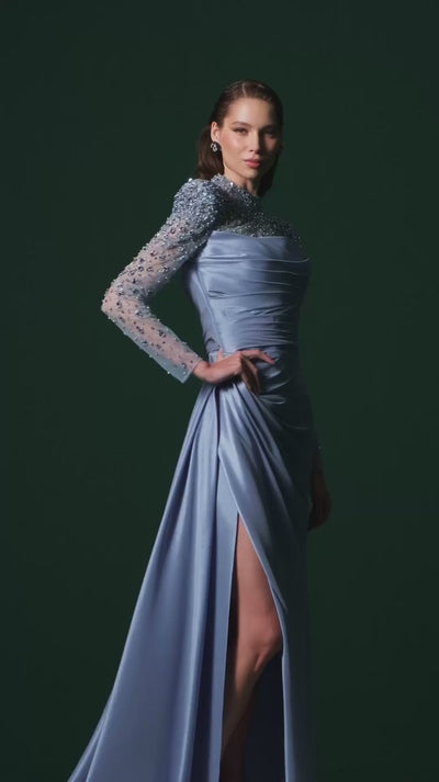 Romantik ve etkileyici detaylarıyla göz kamaştıran Uzun Kırma Kollu Full Beden İşlemeli Prenses Abiye Elbise,