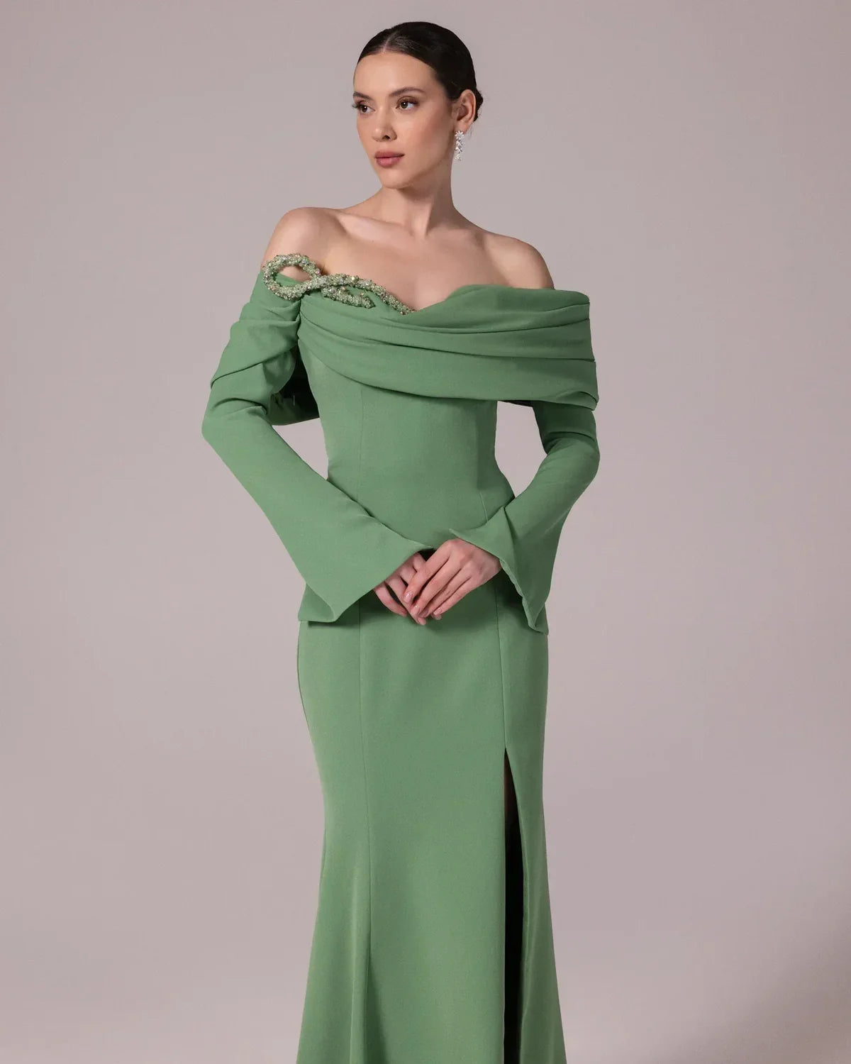 Mermaid-style evening dress with stone detail on the neckline and slit.