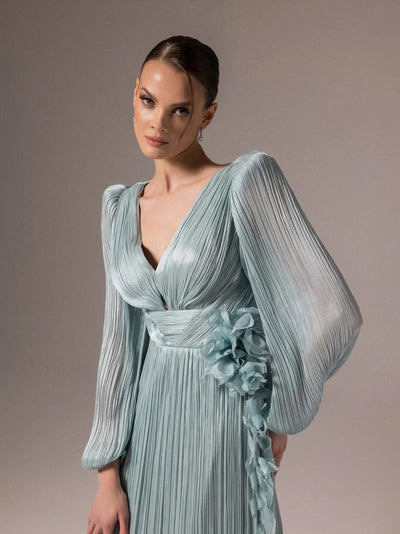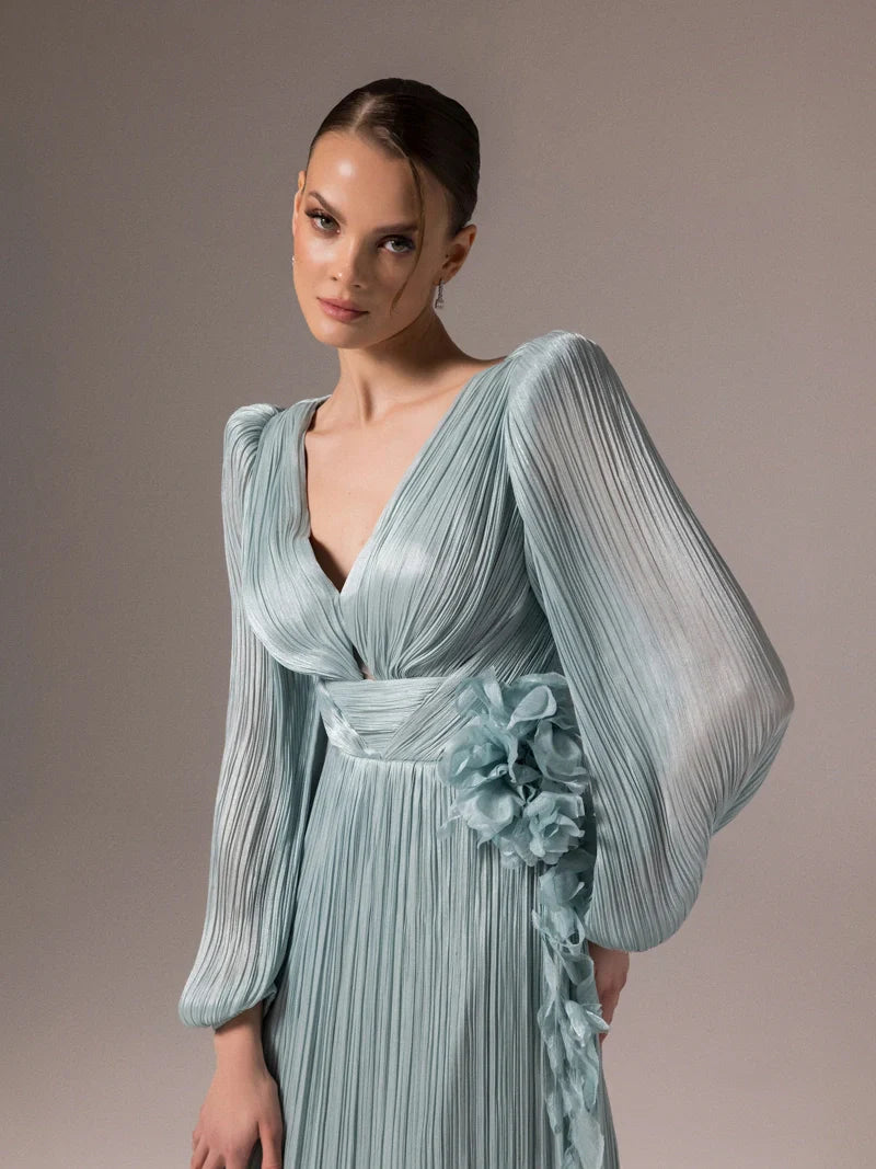 Belde çiçek tasarımı ve V yaka detaylarıyla bu kloş elbise, feminen tarzı ve zarif duruşuyla özel anlarınıza şıklık katar.