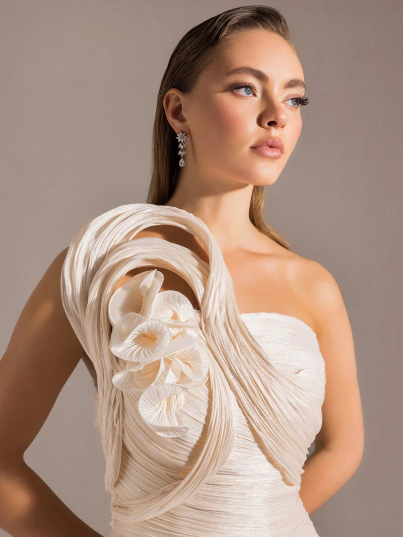 Omuzu Detaylı Pliseli Kloş Abiye Elbise