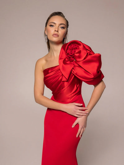 Zarif ve feminen duruşuyla davetlerde etkileyici bir görünüm sağlayacak olan, omuz çiçek detaylarıyla süslenmiş balık elbise, vücut hatlarını zarifçe vurgular.