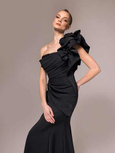 25120-Tek Omuzlu Gül Detaylı Drapeli Balık Abiye Elbise