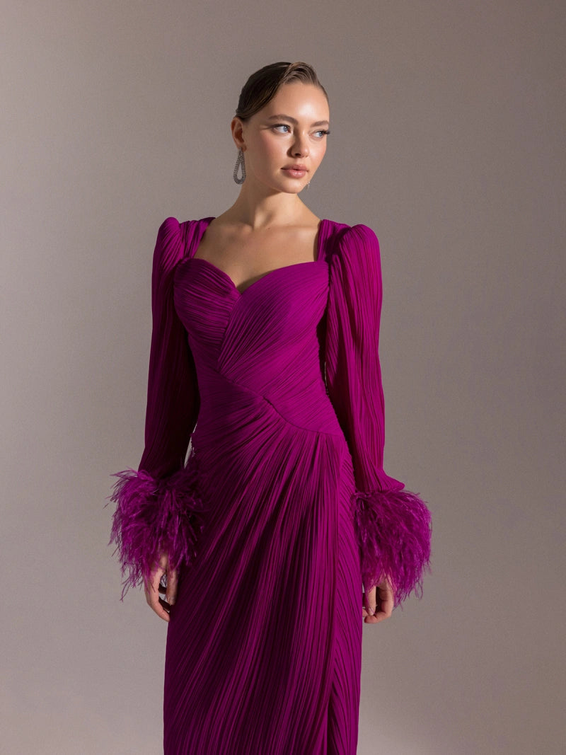 25152-Kolları Otrişli, Pliseli Yıtrmaçlı Abiye Elbise