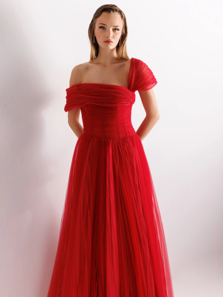 25168-Düşük Omuz Piliseli Kabarık Abiye Elbise