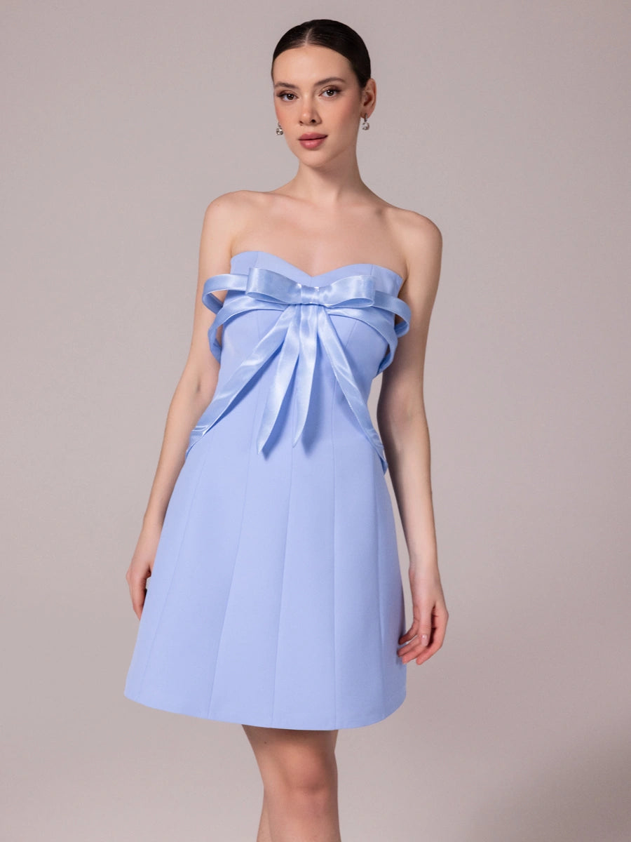 Kalp Yaka Organze Fiyonk Detaylı Kuplu Krep Mini Elbise