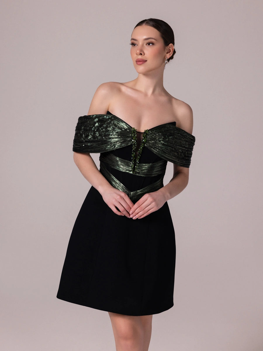 25304-Parlak Kumaş Garnili Yakası İşlemeli Mini Elbise