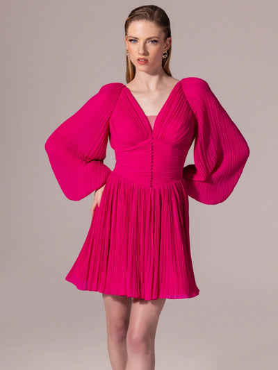 25305-Balon Kollu, Piliseli Mini Elbise