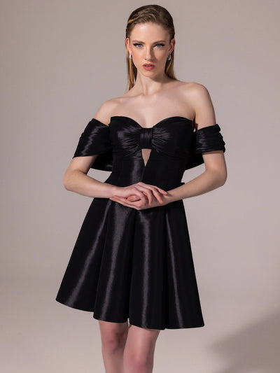 25314-Straplez Fiyonk Detaylı Kuplu Mini Elbise