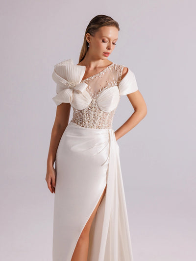 ÜST KOMPLE TAŞ DETAYLI PLİSELİ, YANI KUYRUKLU VE YIRTMAÇLI BALIK ELBİSE