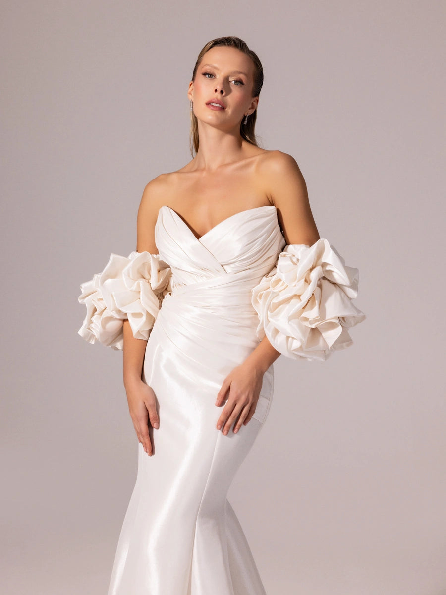 A25068-Straplez Drapeli Balon Kollu Uzun Abiye Elbise