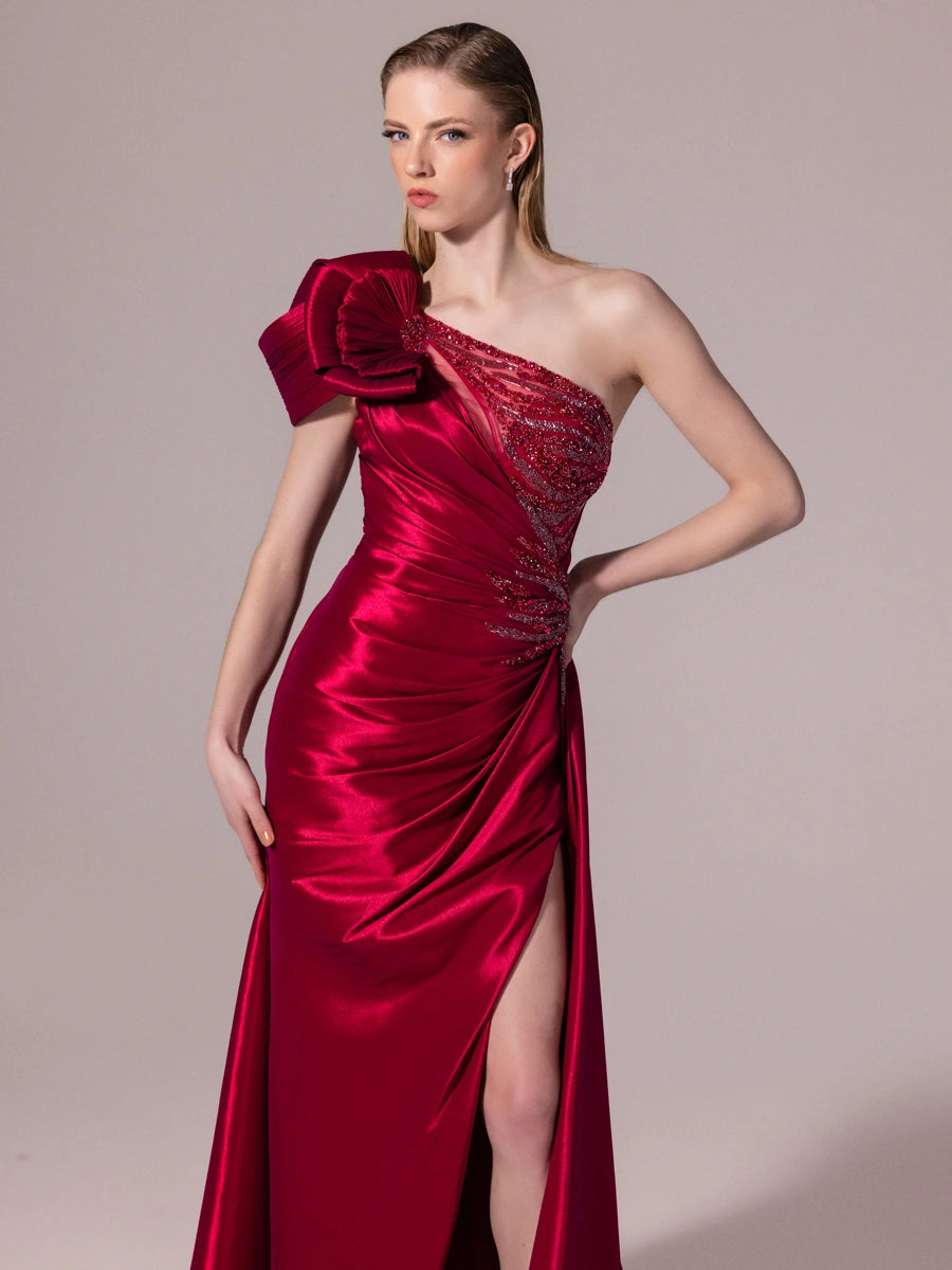 A25085-Asimetrik Kesim Göğsü İşlemeli Yırtmaçlı Balık Abiye Elbise