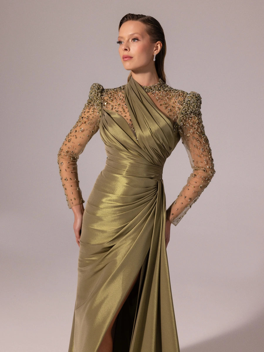 A25096-Kolları İşlemeli Asimetrik Drapeli Balık Abiye Elbise