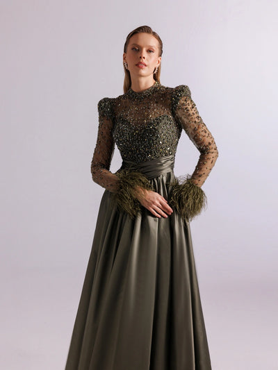 A25100-Hakim Yaka Uzun Kollu Taş İşlemeli Uzun Abiye Elbise